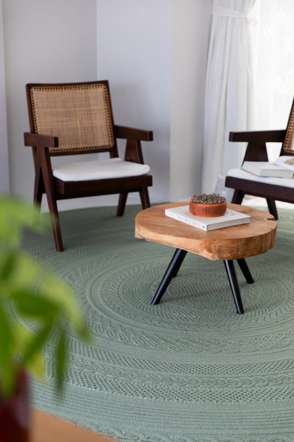 Iyashi met en valeur la beauté naturelle de la laine. Elle souligne sa qualité intemporelle grâce à une technique unique de broderie au point de croix. La forme arrondie du tapis lui permet de s'intégrer facilement dans n'importe quel espace.