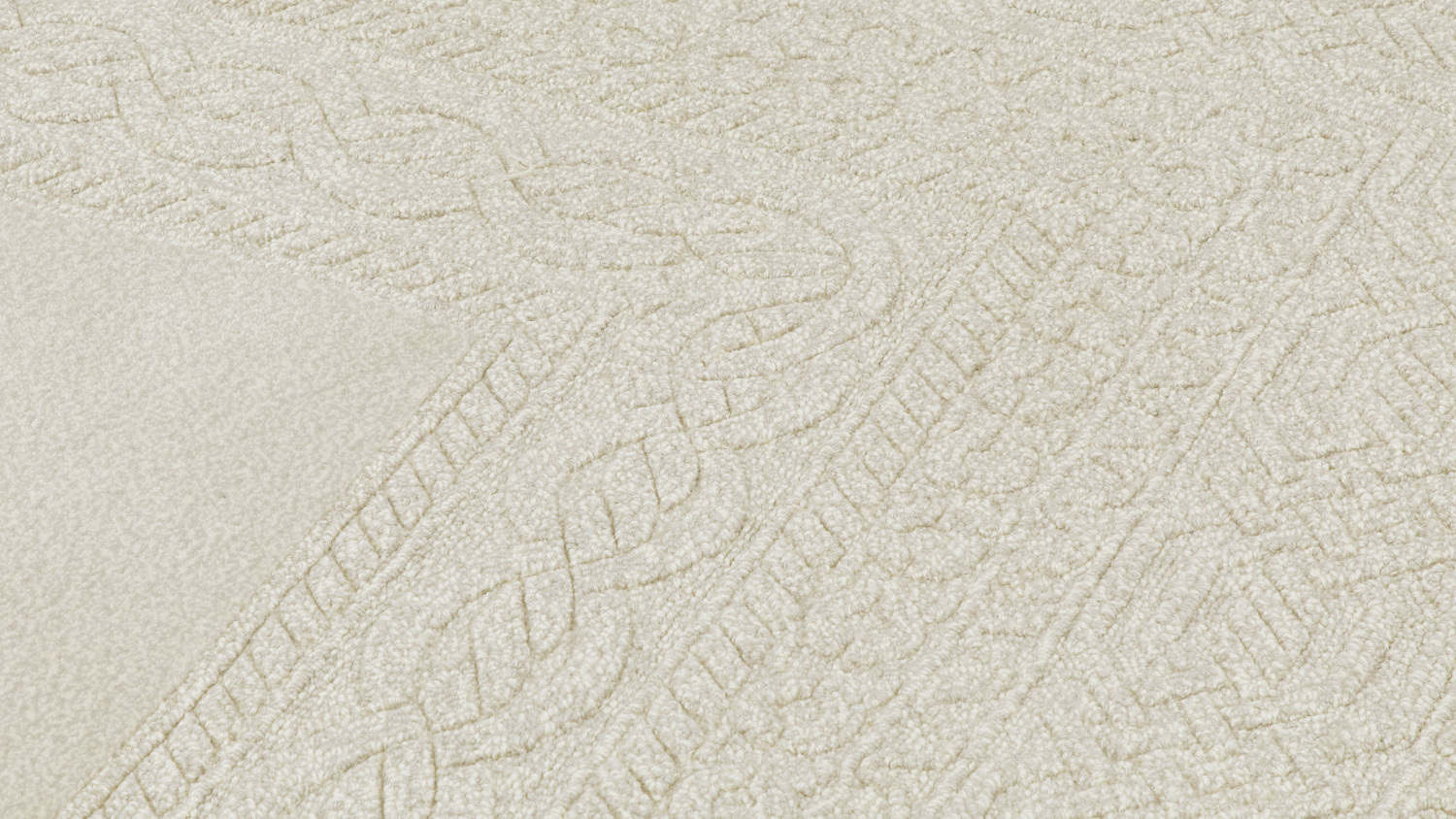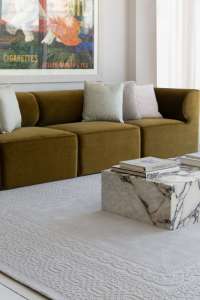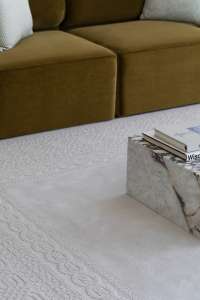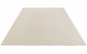 Kara est conçu dans un ton beige chaleureux et une forme rectangulaire, rappelant les pulls tricotés de manière complexe. Il présente des textures coupées et bouclées et des hauteurs de fils variables, créant ainsi une oeuvre en trois dimensions pour le sol.